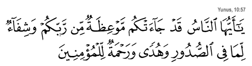 Yaa ayyuha an-naasu qad ja’atkum maw`izhatun min rabbikum wa shifaun limaa fee as-sudoori wa hudan wa rahmatun lil-mumineen